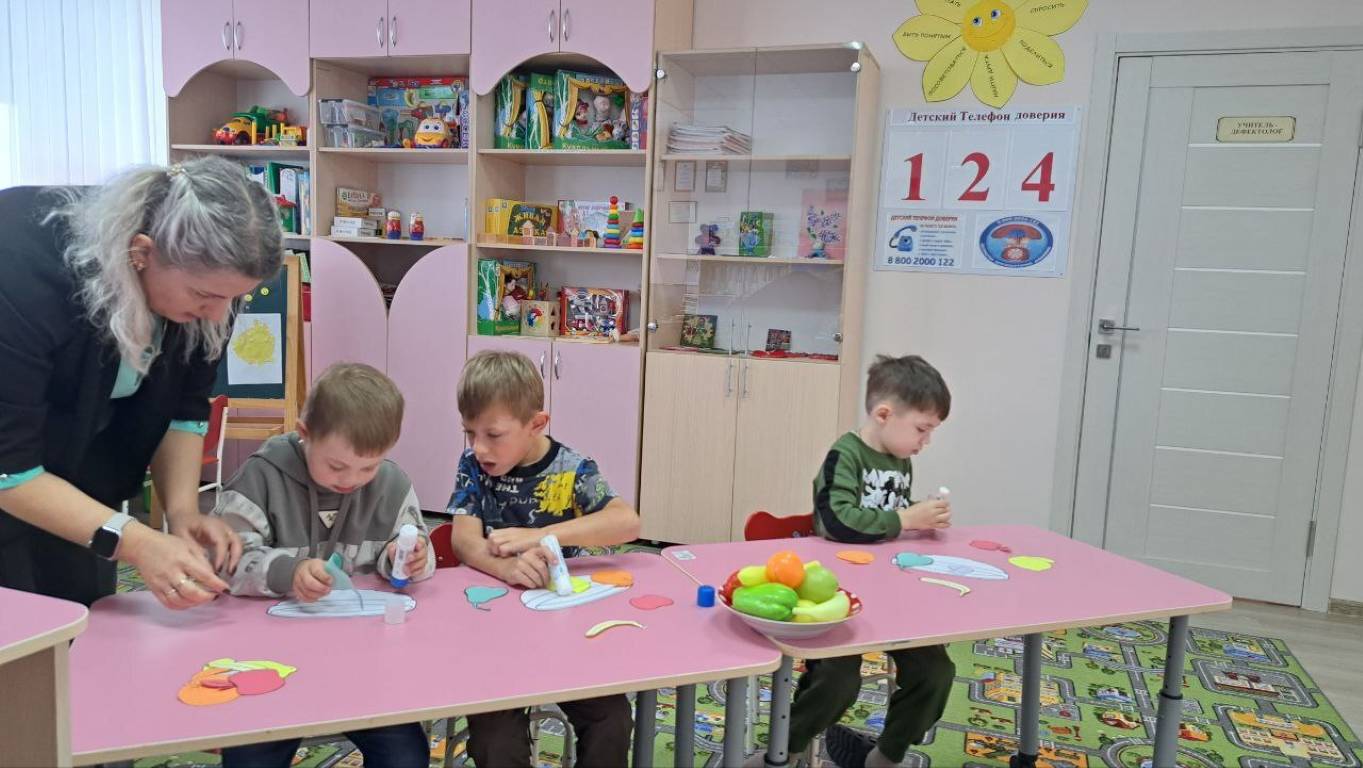 В конце занятия с большим любопытством и желанием ребята изготовили аппликацию «Фруктовая тарелка».