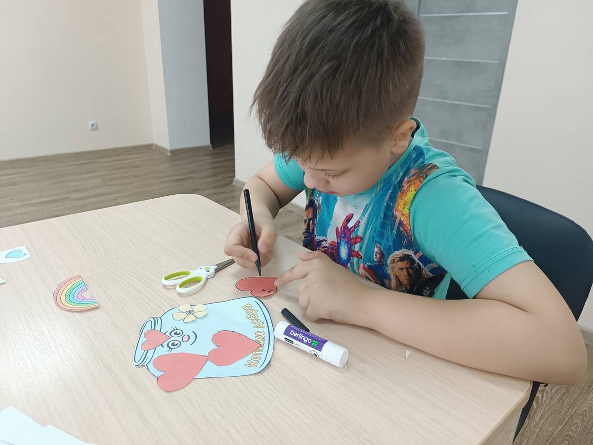 Затем ребята приступили к творческой части — созданию «Копилки добра». Каждый вырезал сердечко, написал на нем вежливое слово и приклеил на общую основу. В копилке появились слова: «спасибо», «я тебя люблю», «добрый день», «ты хороший» и другие. Эта работа сплотила группу и наглядно показала, как добрые слова наполняют пространство позитивом.