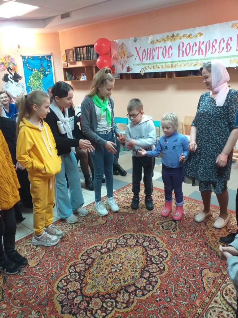 Педагоги школы провели с детьми пасхальные игры с крашеными яичками. Дети передавали друг другу крашеное яичко, у кого оно останавливалось, тот должен был сказать: «Христос Воскресе!», остальные отвечали: «Воистину Воскресе!»