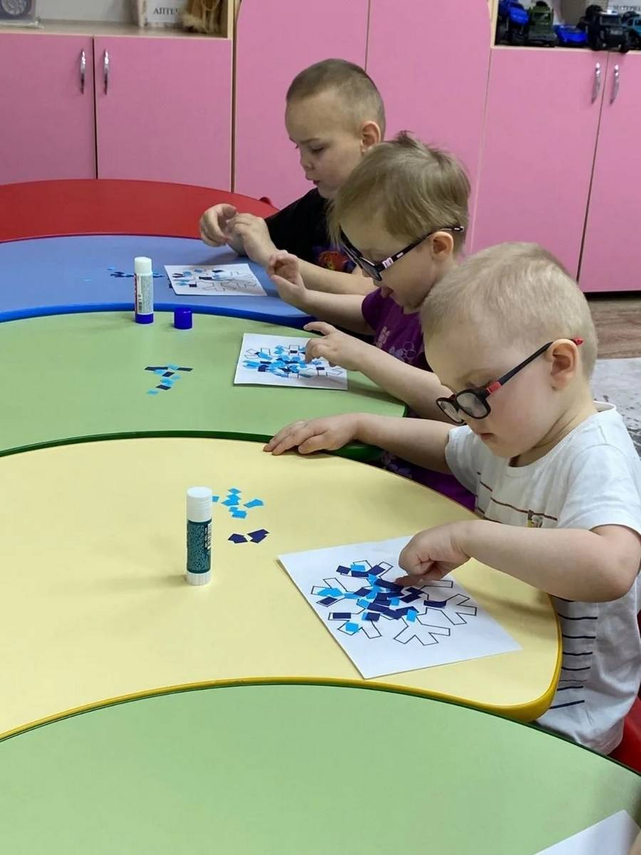 Сегодня в младшей группе прошло творческое занятие по аппликации «Снежинка».