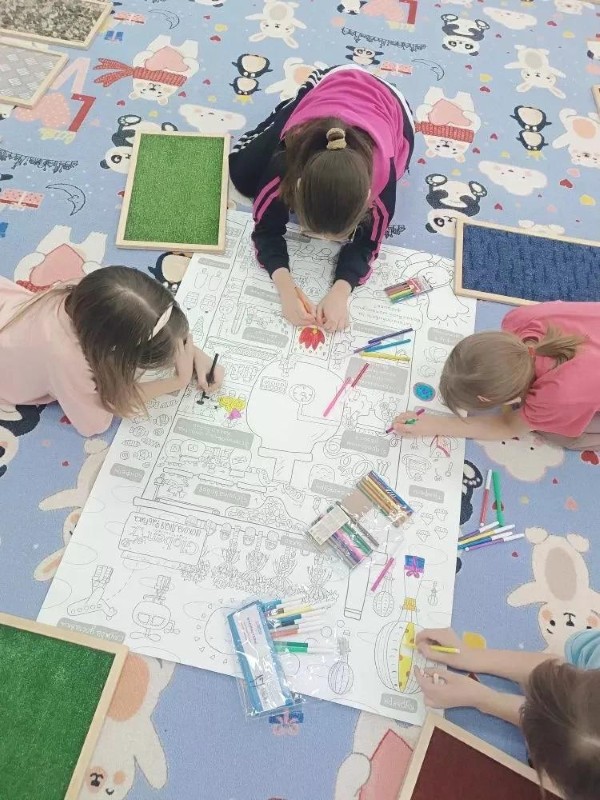 После беседы девочки дружно раскрашивали метровую раскраску. Это помогло снизить эмоциональное напряжение и сплотило коллектив.
